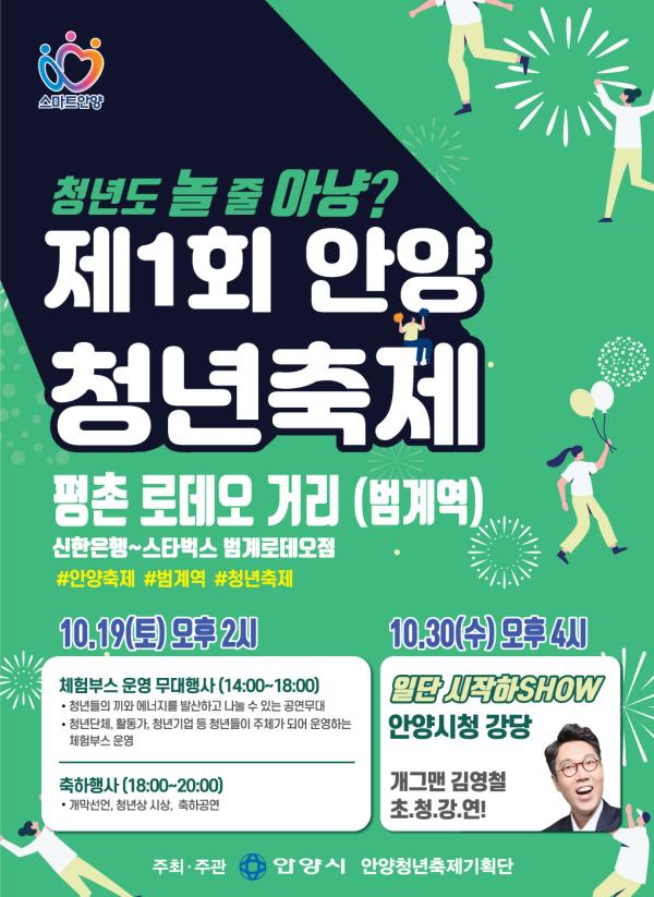 안양시가 주최하고 안양청년축제기획단이 주관하는 이날 축제는 청년들이 스스로 기획하고 진행하는 청년맞춤형 행사로 오후 2시부터 그 서막을 연다.
