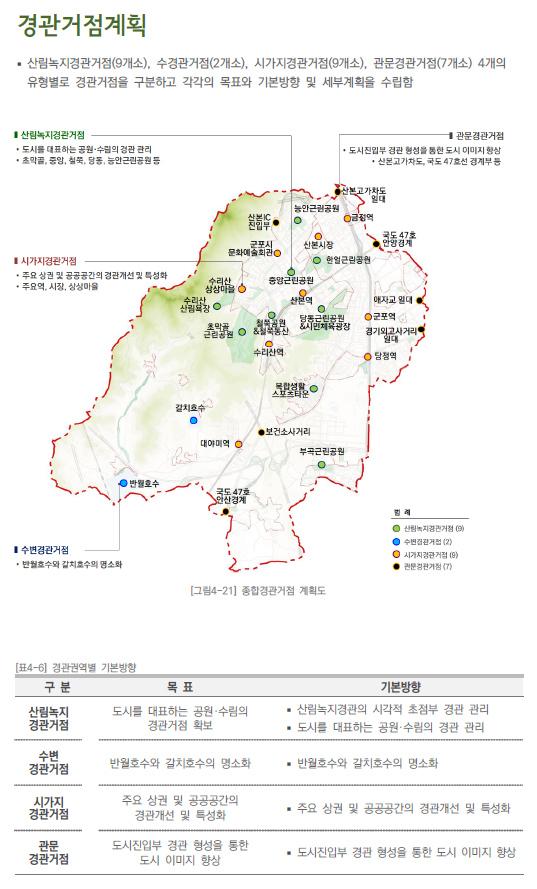또 산림녹지경관거점 수변경관거점, 시가지경관거점, 관문경관거점 등 4개 유형으로 나눈 주요 거점을 지정하여 군포시의 변화하는 경관요소를 분석해 관리 방안을 수립했다.