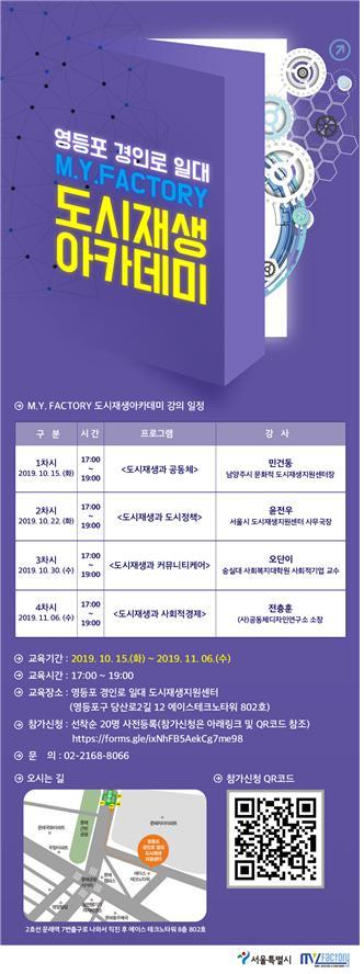 서울시가 영등포 도심권 일대에 새로운 도시기능을 부여하고, 고용기반 창출을 통해 서남권 경제 중심지로 재도약시키기 위해 지정한 ‘영등포 경인로 일대 경제기반형 도시활성화 지역’에 ‘M.Y. Factory 도시재생 아카데미’ 교육을 실시할 계획이다.