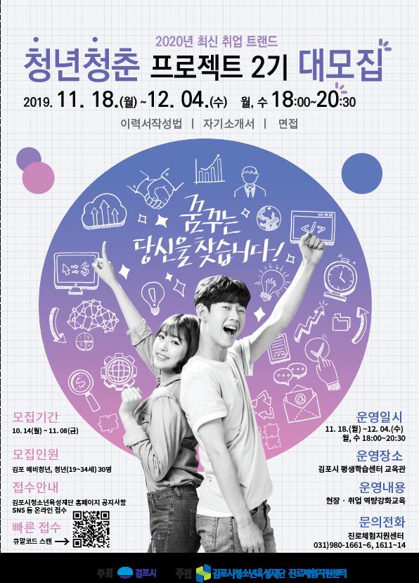 김포시청소년육성재단은 현실적인 취업역량 강화와 특화직업군 취업준비를 위한 ‘청춘프로젝트 2기’를 모집한다.