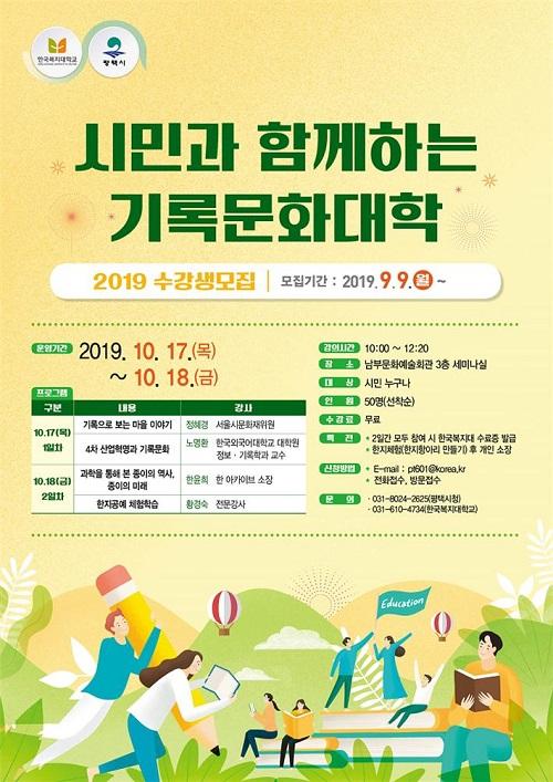 평택시는 시민을 대상으로 오는 17일부터 18일까지 2일간 남부문화예술회관에서 ‘2019 시민과 함께하는 기록문화대학’을 개최한다.