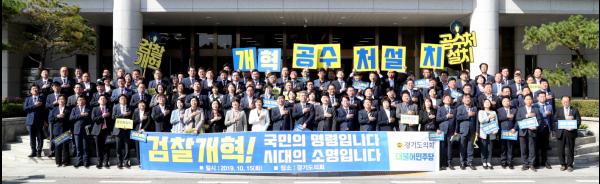 경기도의회 더불어민주당은 15일 의원총회가 끝난 후 의회 현관 앞에서 ‘경기도의회 더불어민주당 검찰개혁 촉구 결의대회’를 개최하고 조속한 검찰개혁을 촉구했다.