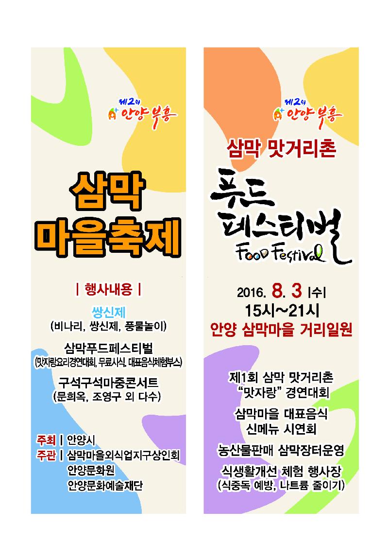 안양시가 주관하고 삼막마을외식업지구상인회·안양문화원·안양문화예술재단이 주최하는 이번 축제는 삼막마을이 우수외식업지구로 선정된 이후 처음 열리는 행사로서 입·눈·귀가 즐거운 시간이 될 것이다.