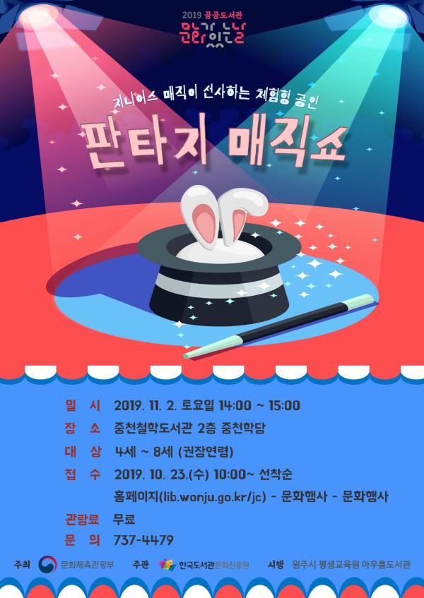원주시 아우름도서관이 ‘2019년 공공도서관 문화가 있는 날’ 행사로 오는 11월 2일 오후 2시 중천철학도서관 2층 중천학당에서 지니어스 매직의 ‘판타지 매직쇼’를 공연한다.