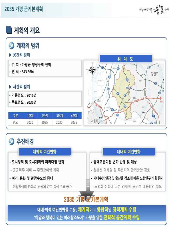 이번에 확정된 ‘2035년 가평 군기본계획’은 가평군에서 수립한 2035년까지의 장기적인 도시발전 로드맵이다. 기존계획인 ‘2020 군기본계획’과 비교해 인구목표를 13만명에서 3만명 감소한 10만명으로 계획했다.