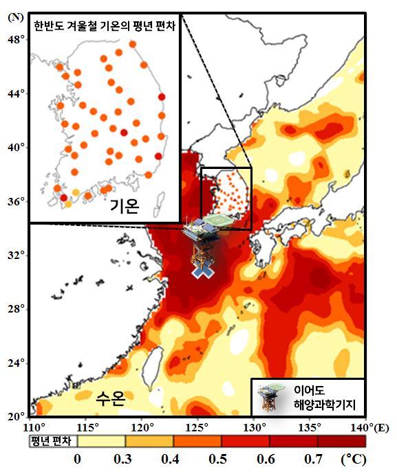 이어도 해역의 수온은 한반도 기온보다 1~2개월 빨리 변한다. 이번 연구에서는 이어도 주변해역의 수온이 평년에 비해 0.6~0.7℃ 오를 경우, 약 1~2개월 뒤에 우리나라 겨울철 기온도 평년 대비 0.3~0.5℃ 오른다는 관련성을 확인했다. 이러한 현상은 수온이 내려가는 경우에도 동일하게 확인됐다.