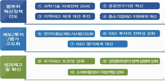 먼저, 국가과학기술혁신 정책의 방향성을 제시하기 위해 과학기술 미래전략 2045를 수립하고, 공공연구기관 혁신, 지역R&D 및 중소기업 R&D 지원체계 개선 등 국가R&D 성과제고 및 효율화를 위한 범부처 종합·조정 기능을 강화해 나갈 계획이다.