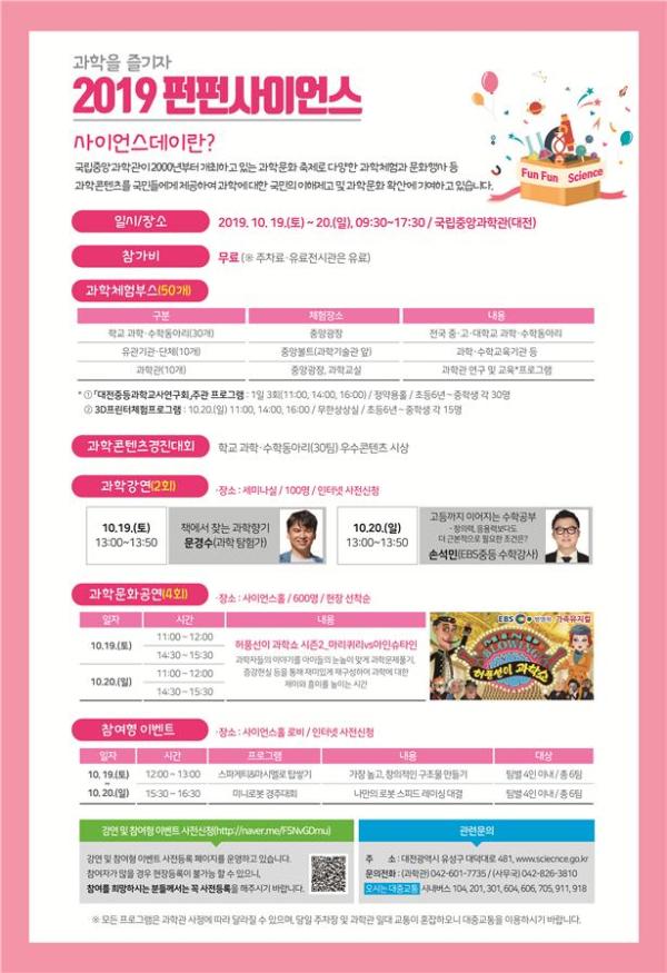국립중앙과학관은 과학과 수학을 직접 체험해 볼 수 있는 과학문화축제 “2019 펀펀사이언스”를 오는 19일부터 20일까지 2일간 국립중앙과학관에서 개최한다고 밝혔다.