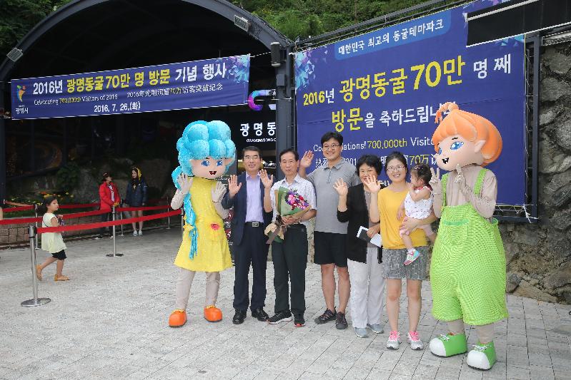 이날 70만 번째 관광객의 행운은 3대 가족 5명이 함께 광명동굴을 찾은 장동춘(인천 남동구, 42세)씨가 차지했으며, 장 씨 가족은 양기대 광명시장으로부터 꽃다발과 국산와인을 선물로 받았다.
