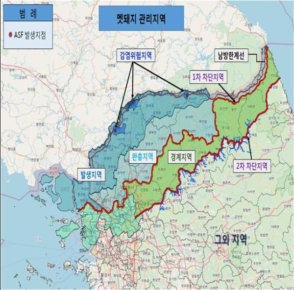 한편, 환경부의 ‘야생멧돼지 포획 강화 관리지역 지침’은 감염 위험 정도에 따라 멧돼지 관리지역을 감염위험지역 발생·완충지역 경계지역 차단지역 등으로 분류하고 있다.