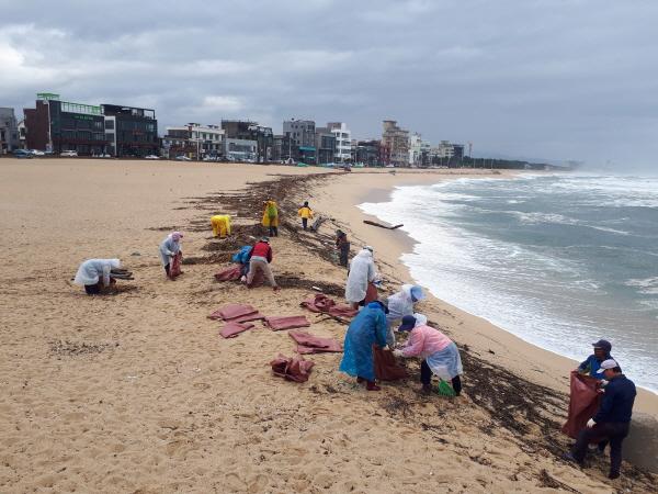 지난 3일 발생한 18호 태풍‘미탁’, 19호 ‘하기비스’의 영향으로 해안으로 밀려온 목재쓰레기 및 해초수거작업을 진행하고 있다.