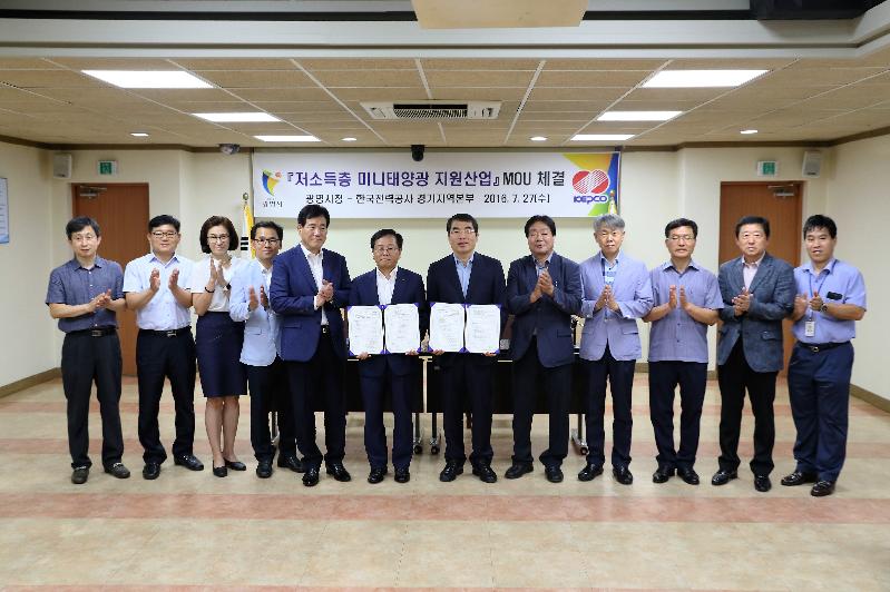 [미디어타임즈= 신정식 기자]광명시(시장 양기대)는 27일 오전 시청 중회의실에서 한국전력경기지역본부와 저소득층 미니태양광 지원사업을 위한 업무협약을 체결했다고 밝혔다.