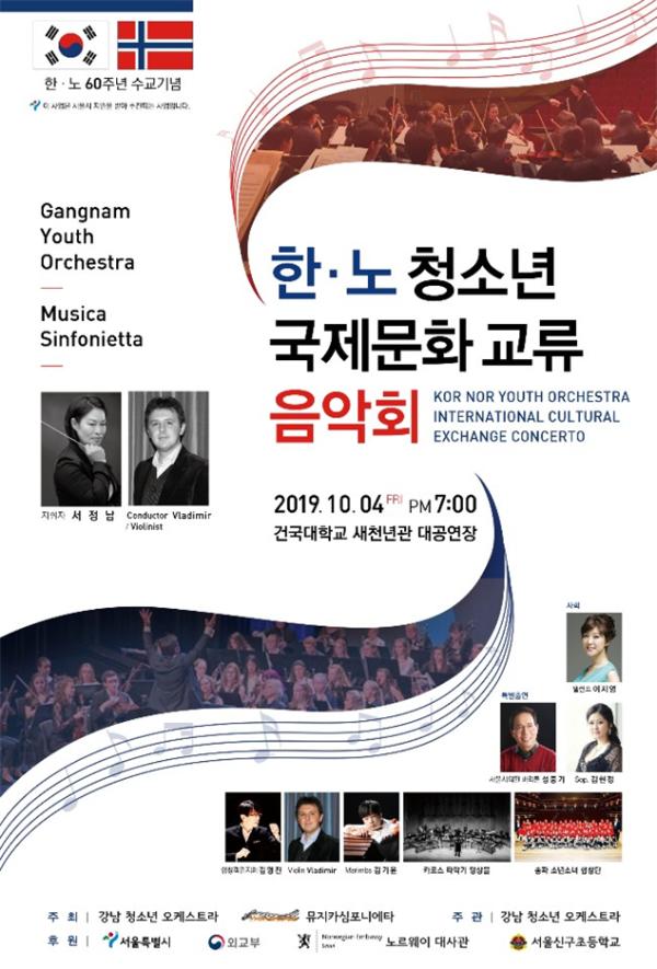 강남구 청소년 오케스트라는 지난 4일 건국대학교 새천년관 대공연장에서 노르웨이 청소년 오케스트라 Musica Sinfonietta와 함께 ‘한-노 청소년 국제문화교류 음악회’를 개최했다.