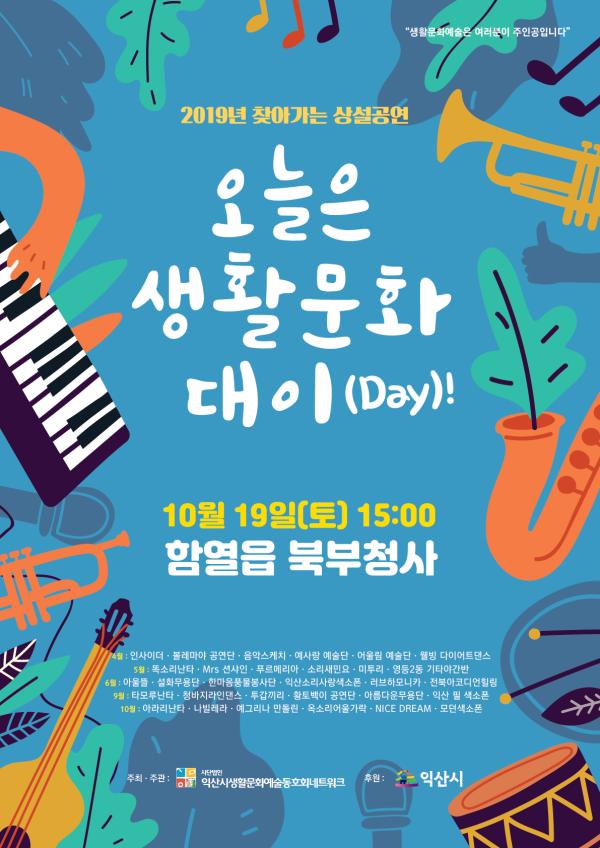 익산시)는 오는 19일 함열읍에 위치한 북부청사에서 2019 찾아가는 상설공연 함열읍 편 ‘오늘은 생활문화 Day’를 개최한다고 밝혔다.