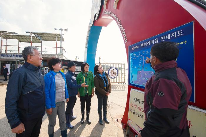 | 경제환경위원회 위원들이 백미리 어촌체험마을 입구에서 설명을 청취하고 있다. |
