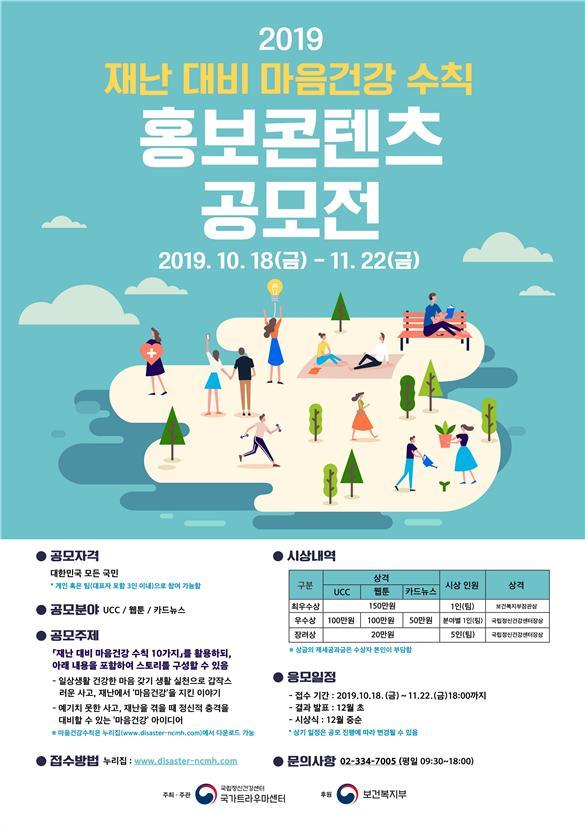 보건복지부는 국립정신건강센터 국가트라우마센터에서 재난 대비 정신건강 대국민 인식 제고를 위해 ‘2019 재난 대비 마음건강 수칙 홍보콘텐츠 공모전’을 10월 18일부터 11월 22일까지 실시한다고 밝혔다.