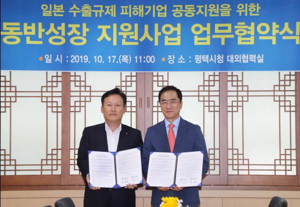 평택시가 17일 시청 대외협력실에서 평택시와 IBK기업은행간 ‘일본 수출규제 피해 중소기업 지원을 위한 동반성장 지원사업 협약식’을 가졌다고 밝혔다.
