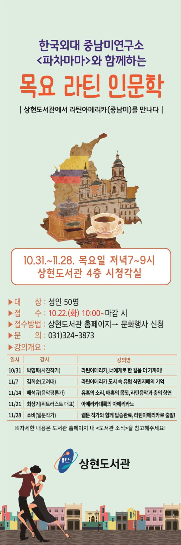 용인시 상현도서관은 오는 31일부터 11월28일까지 4층 시청각실에서 매주 목요일마다 라틴문화를 소개하는 인문학 특강을 연다.