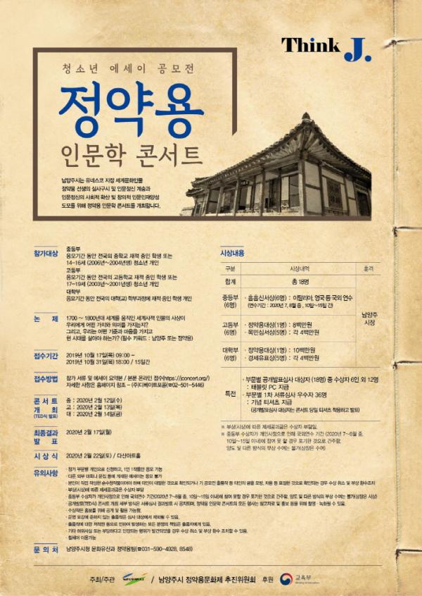 남양주시는 17일부터 오는 31일까지 전국 청소년 에세이 공모전 ‘정약용 인문학 콘서트’의 온라인 참가접수를 진행한다.