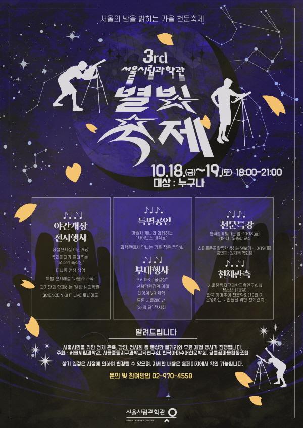 서울시립과학관은 18일부터 오는 19일까지 2일간 밤 9시까지 ‘2019 서울시민 별빛축제’를 개최한다고 밝혔다. 본 행사는 서울중등지구과학교육연구회, 한국아마추어천문학회와 공동으로 주관하며 과학관을 방문하는 시민들 누구나 참여하고 즐길 수 있는 수 있는 다채로운 프로그램이 마련되어 있다.