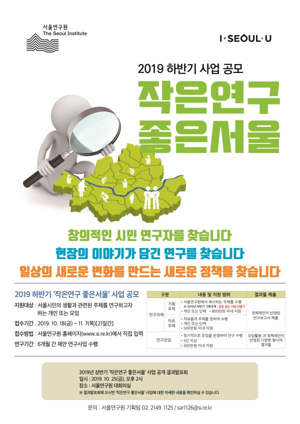 2019년 하반기‘작은연구 좋은서울’사업 선정결과는 11월 중 서울연구원 누리집에서 확인할 수 있다.