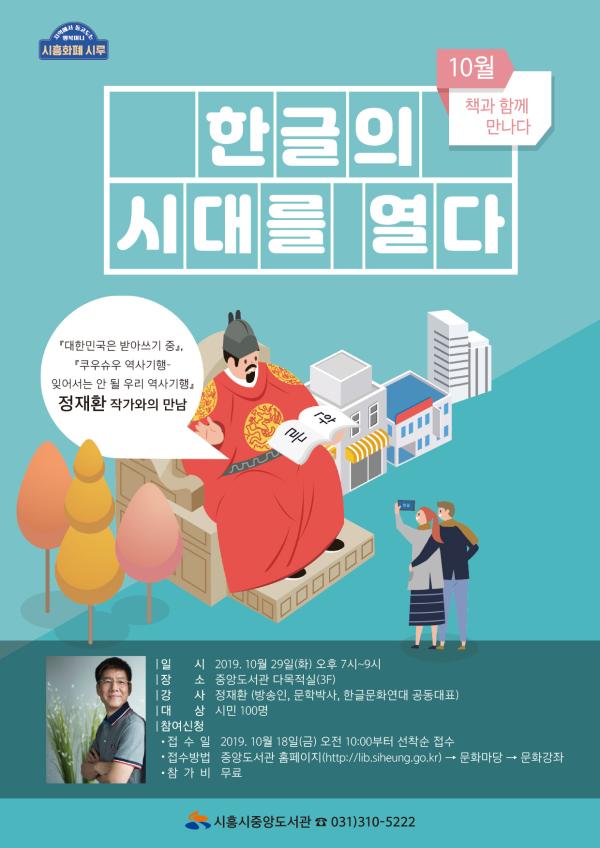 오는 29일 ‘10월 책과 함께 만나다’ 프로그램은 한글문화연대 공동대표이자 역사학자인 정재환 작가를 만난다. 방송인으로 활동하던 정재환 작가는 ‘대한민국은 받아쓰기 중’ ‘쿠우슈우 역사기행-잊어서는 안 도리 우리 역사기행’ 등을 책을 펴내기도 했다. 이번 강연은 특히 한글날이 있는 10월, 한글 강연을 통해 소중한 우리말에 대한 지식을 얻는 재미를 더할 것으로 기대된다.