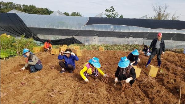 안양시 평촌동 주민자치위원회를 비롯한 동 사회단체 회원들이 지난 17일 경기 시흥에 위치한 주말농장 ‘행복 스마트 팜’에서 고구마를 수확하며 구슬땀을 흘렸다.