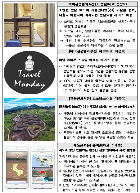 구체적 사업 내용을 보면 예비관광벤처에는 ‘사물인터넷 스마트 시스템을 적용한 개인 맞춤형 캡슐호텔’, ‘창작자 활용 여행 영상 유통 플랫폼’, 등이, 관광벤처에는 ‘정보통신기술 기반 무동력 레이싱 테마파크’, ‘창의적인 야간 관광체험 제공’ 사업 등이, 재도전벤처에는 ‘지도와 영상 콘텐츠 활용 관광 웹페이지 제작 플랫폼’, ‘무슬림 관광객을 위한 할랄 한식’ 사업 등이 포함됐다.