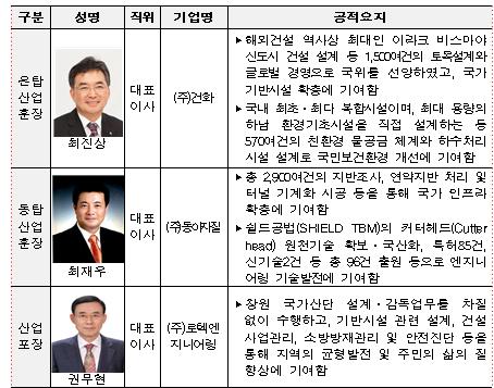 건화 최진상 대표이사에게 은탑산업훈장이, 동아지질 최재우 대표이사에게 동탑산업훈장, ㈜로텍엔지니어링 권무현 대표이사에게 산업포장이 수여됐다.