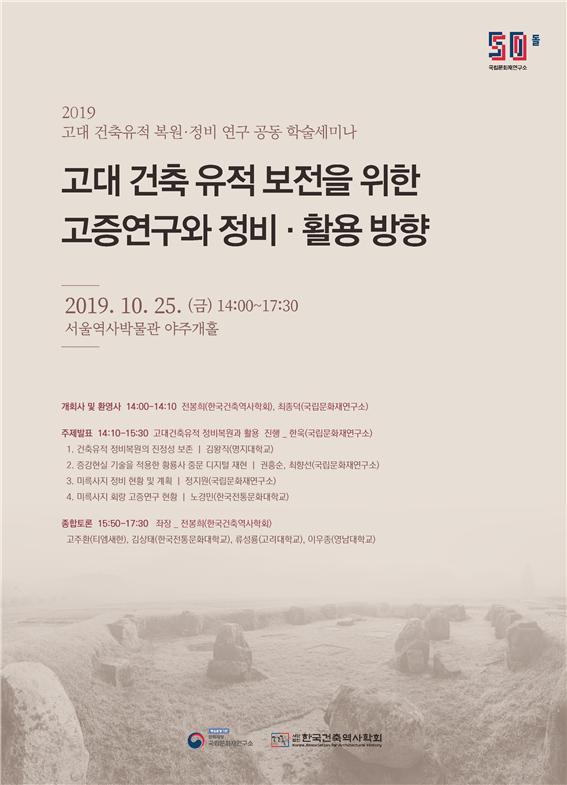 문화재청 국립문화재연구소는 한국건축역사학회와 함께 오는 25일 서울역사박물관 야주개홀에서 ‘고대 건축 유적 보전을 위한 고증연구와 정비·활용 방향’을 주제로 공동 학술세미나를 개최한다.