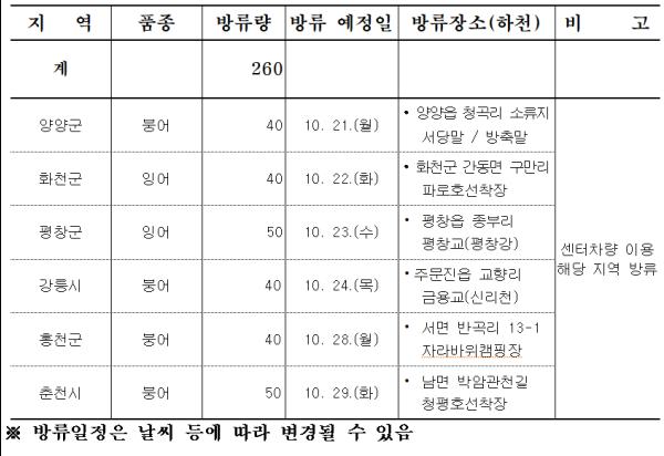 강원도내수면자원센터는 우리나라 향토어종인 “붕어, 잉어 어린고기 26만마리를 오는 21일부터 29일까지 도내 6개 지역의 호소 및 하천에 방류할 계획“이라고 밝혔다.