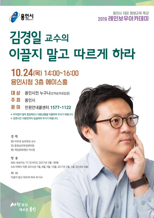 용인시는 오는 24일 시청 에이스홀에서 시민을 위한 무료강좌인 ‘레인보우 아카데미’의 10월 행사로 김경일 아주대 심리학과 교수의 특강을 연다.