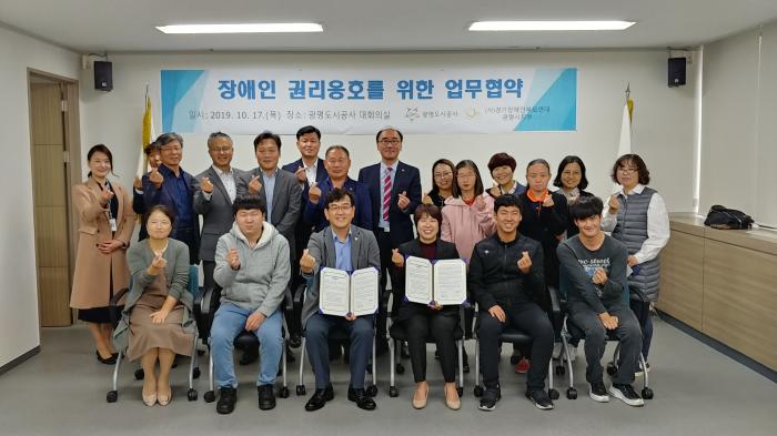 광명도시공사(사장 김종석)와 사단법인 경기도장애인부모연대 광명시지부 (회장 김수연)는 17일(목) 오후 광명도시공사 본부에서‘장애인 권리옹호를 위한 업무협약’을 체결했다.