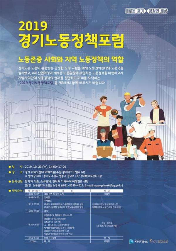 경기도와 경기연구원은 오는 23일 오후 2시 경기도경제과학진흥원 바이오 센터 대회의실에서 ‘노동존중 사회와 지역 노동정책의 역할’을 주제로 ‘2019 경기노동정책 포럼’을 개최한다고 밝혔다.
