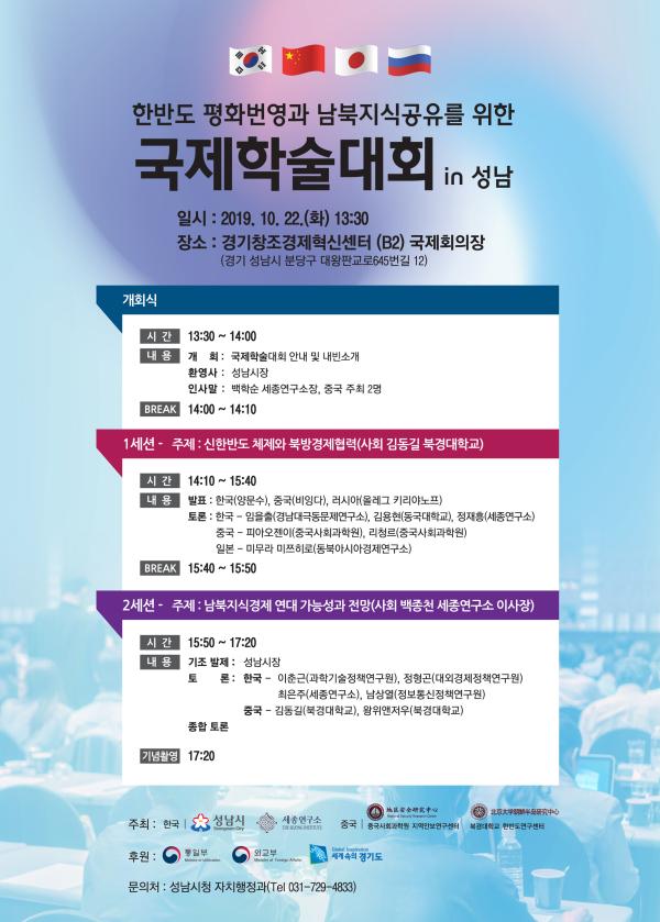 북방경제권 국가 간 협력 방안을 모색하고 남북교류 협력의 새로운 비전 제시를 위해 성남시와 세종연구소, 중국 사회과학원 지역안보연구센터, 북경대학교 한반도연구센터가 공동 주최해 마련하는 행사다.