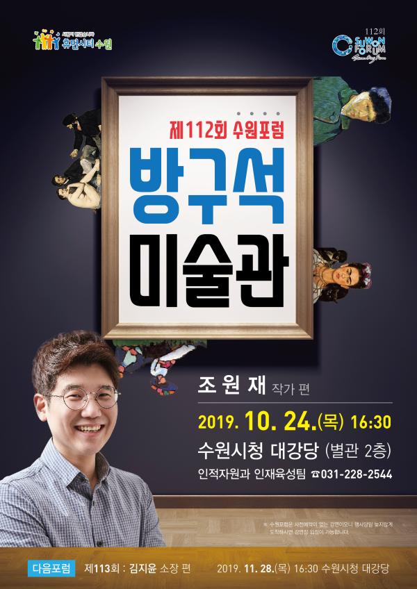 수원시가 오는 24일 오후 4시 30분 시청 대강당에서 ‘제112회 수원 포럼’을 연다. 조원재 작가가 ‘방구석 미술관’을 주제로 강연한다.