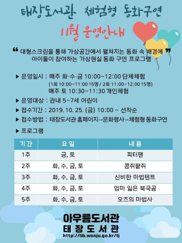 태장도서관 체험동화관에서 매주 화·수·금요일은 10시부터 12시까지 어린이집 및 유치원 등 단체 체험, 매주 토요일은 10시 30분부터 11시 30분까지 개인 체험으로 진행한다.