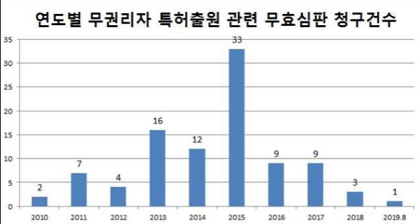 무권리자의 특허출원 관련 무효심판 96건의 결과를 살펴보면, 66건이 기각됐고, 30건이 인용되어 무효로 판단됐다.
