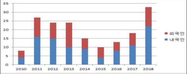 출원건수는 2015년 10건, 2016년 13건, 2017년 18건으로 꾸준히 증가해 오다가 2018년에는 33건으로 2017년 대비 83.3% 급증했다.