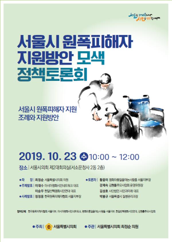 서울시의회 환경수자원위원회 최정순 의원 주관으로 오는 23일 오전10시 서울시의회 제2대회의실에서 한국원폭피해자협회 서울지부, 아시아평화시민네트워크, 평화와통일을여는사람들 서울지부, 한일반핵평화시민연대, 김형률추모사업회와 함께 ‘서울시 원폭피해자 지원방안 모색 정책토론회’를 개최한다.