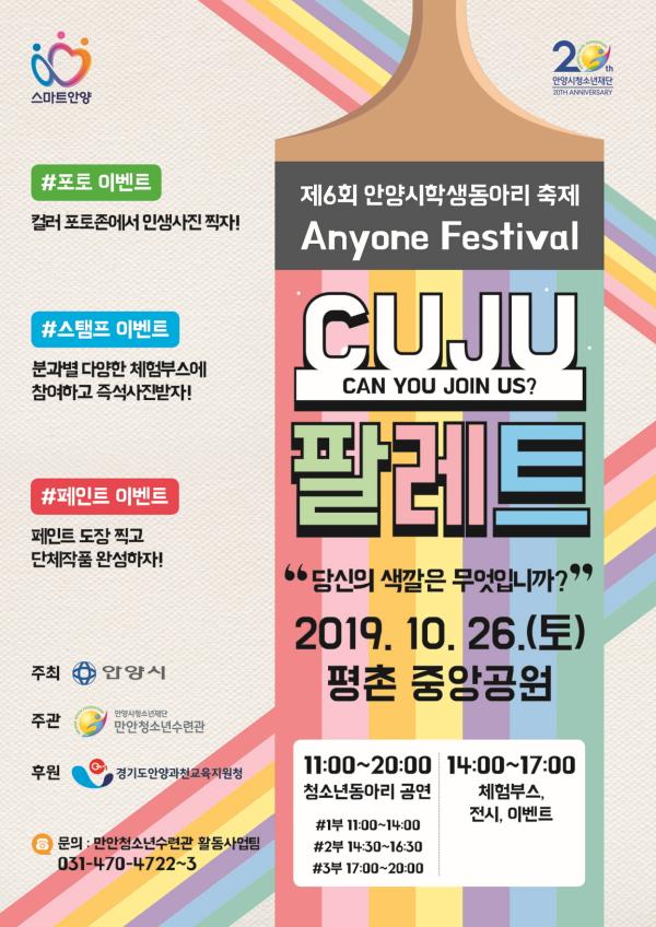 제6회 안양시학생동아리축제 ‘Anyone Festival’이 주말인 오는 26일 오전 11시부터 오후 8시까지 평촌 중앙공원에서 벌어진다.