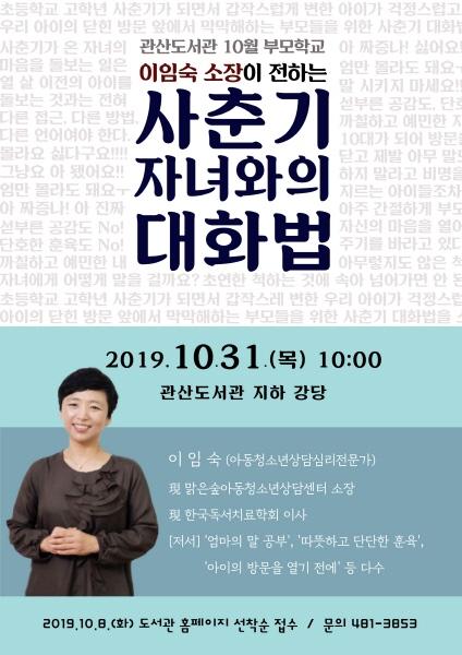 10월 부모학교 특강은 아동 청소년 심리상담사, 의사소통 전문가로 활발히 활동하고 있는 이임숙 맑은숲아동청소년상담센터 소장이 맡아 ‘사춘기 자녀와의 대화법’을 주제로 이달 31일 오전 10시 관산도서관 지하 강당에서 열린다.