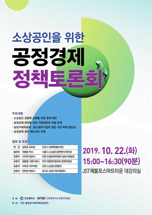 인천광역시는 ‘소상공인을 위한 공정경제 정책토론회’를 22일 오후 3시에 JST제물포스마트타운 대회의실에서 개최한다.