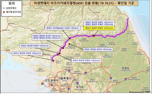 과학원은 10월 21일 오후 11시 30분 경 폐사체에서 아프리카돼지열병 바이러스를 확진했다. 이로써 현재까지 확진된 아프리카돼지열병은 총 12건으로 늘어났다.