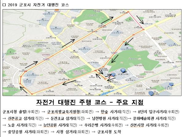 한편 참가자 전원은 안전용구 착용이 의무이며, 자전거 무료 수리 부스는 군포시자전거연합회에서 행사 시작 시간부터 정오까지 운영될 예정이다.