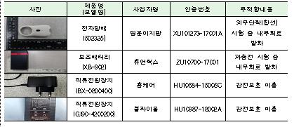 외부단락·과충전 시험 중에 발화하는 등 안전기준에 부적합한 전자담배 1개, 보조배터리 1개, 직류전원장치 2개 등 총 4개 모델에 대해 리콜 명령 조치를 했다.