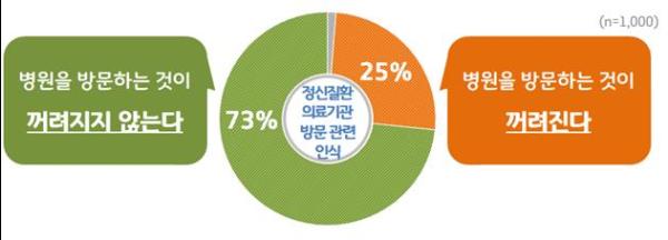 이밖에 정신질환 의료기관 방문이 꺼려지는지 여부를 물은 결과, “꺼려지지 않는다”는 응답이 73%, “꺼려진다”는 응답이 25%로 나타났다.