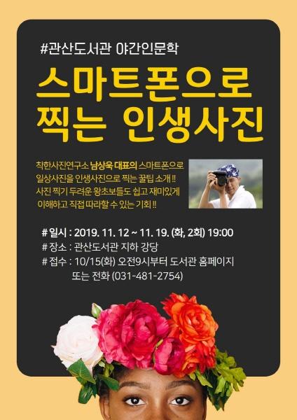 야간인문학은 관산도서관 개관시간 연장 문화행사의 일환으로 직장인이 퇴근 후 참여할 수 있는 저녁 시간에 2회에 걸쳐 진행된다. 강연은 ‘포토테라피’, ‘집에서 뚝딱 찍는 쇼핑몰 사진’의 저자인 남상욱 착한사진연구소·매직페이스 대표가 맡는다.