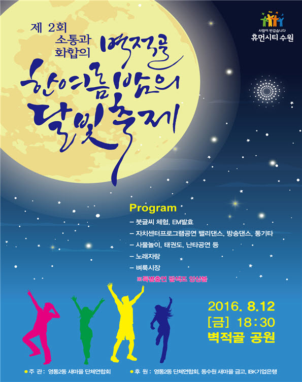 수원시 영통구 영통2동 새마을단체연합회는 오는 12일 저녁 6시 30분부터 ‘제2회 벽적골 한여름 밤의 달빛축제’를 개최한다.