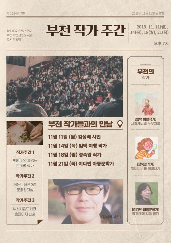 부천시가 오는 11월 11일부터 21일까지 ‘부천작가주간’으로 정하고, 부천과 인연이 있는 분야별 대표 작가를 초청해 릴레이 강연을 개최한다.